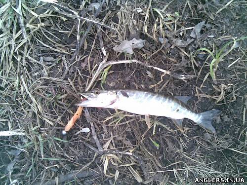 Клюет однако! Поймал две щуки, но , что самое обидное третья щучара откусила самый уловистый воблер 2010 года. Вернее не откусила, стояла сталька поводок, но очень короткий. Эта не хорошая, щука, перевернулась на спину и срезала шнур вместе с воблером. Воблер не дорогой, Mikadо, но уж очень уловистый.